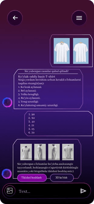 Biz bilan hammasi oson, ilovani yuklab oling, o'zingizga yoqqan kiyimni joylashtiring, Ai so'ragan o'lchamlarni yuboring va kiyimizngiz tikish uchun tayyor qani kettik :)
